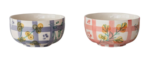 5" Round x 2-1/2"H Hand-Painted Stoneware Bowl w/ Grid Pattern & Botanicals, Multi Color, 2 Styles (Each One Will Vary)
