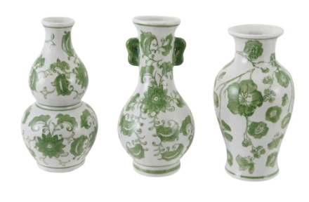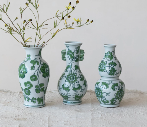 3" Round x 7"H Hand-Painted Stoneware Vase w/ Floral Design, Green & White, 3 Styles