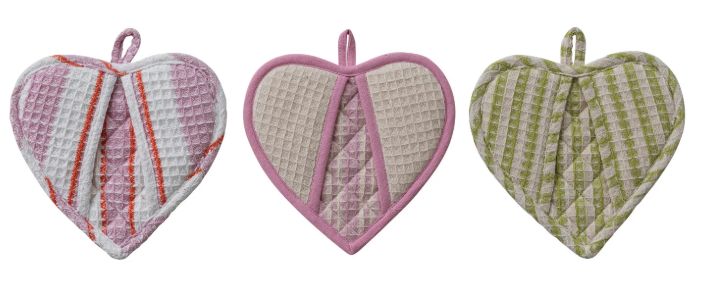 10"L x 8"W Cotton Quilted Waffle Weave Heart Shaped Pot Holder w/ Stripes, Multi Color, 3 Styles