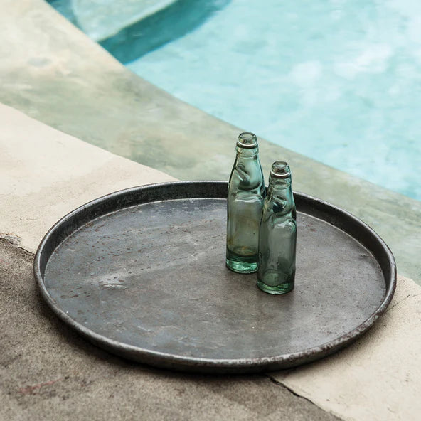 These vintage-inspired trays were modeled after traditional Indian baking and serving pieces. This tray is handcrafted of iron zinc. Patina varies.