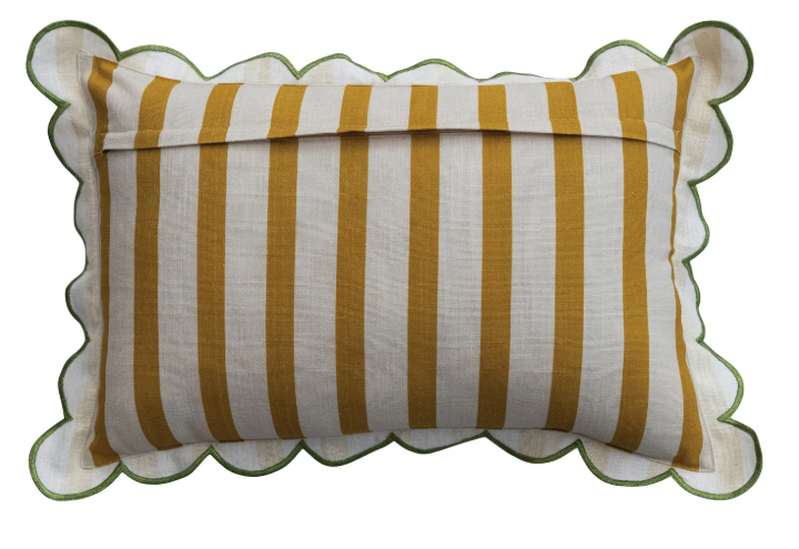 24"L x 16"H Cotton Printed Striped Lumbar Pillow w/ Scalloped Flange & Contrasting Stitched Edge, Mustard Color, Ivory Color & Green