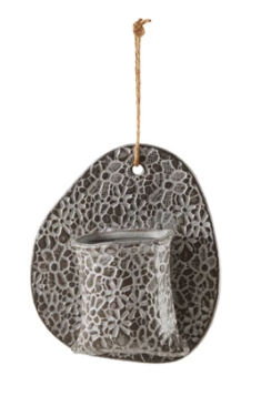 Approximately 5-1/2"W x 2-1/2"D x 7-1/4"H Textured Stoneware Wall Vase w/ Embossed Stamp Pattern & Jute Hanger, Reactive Glaze, 3 Styles (Each One Will Vary)
